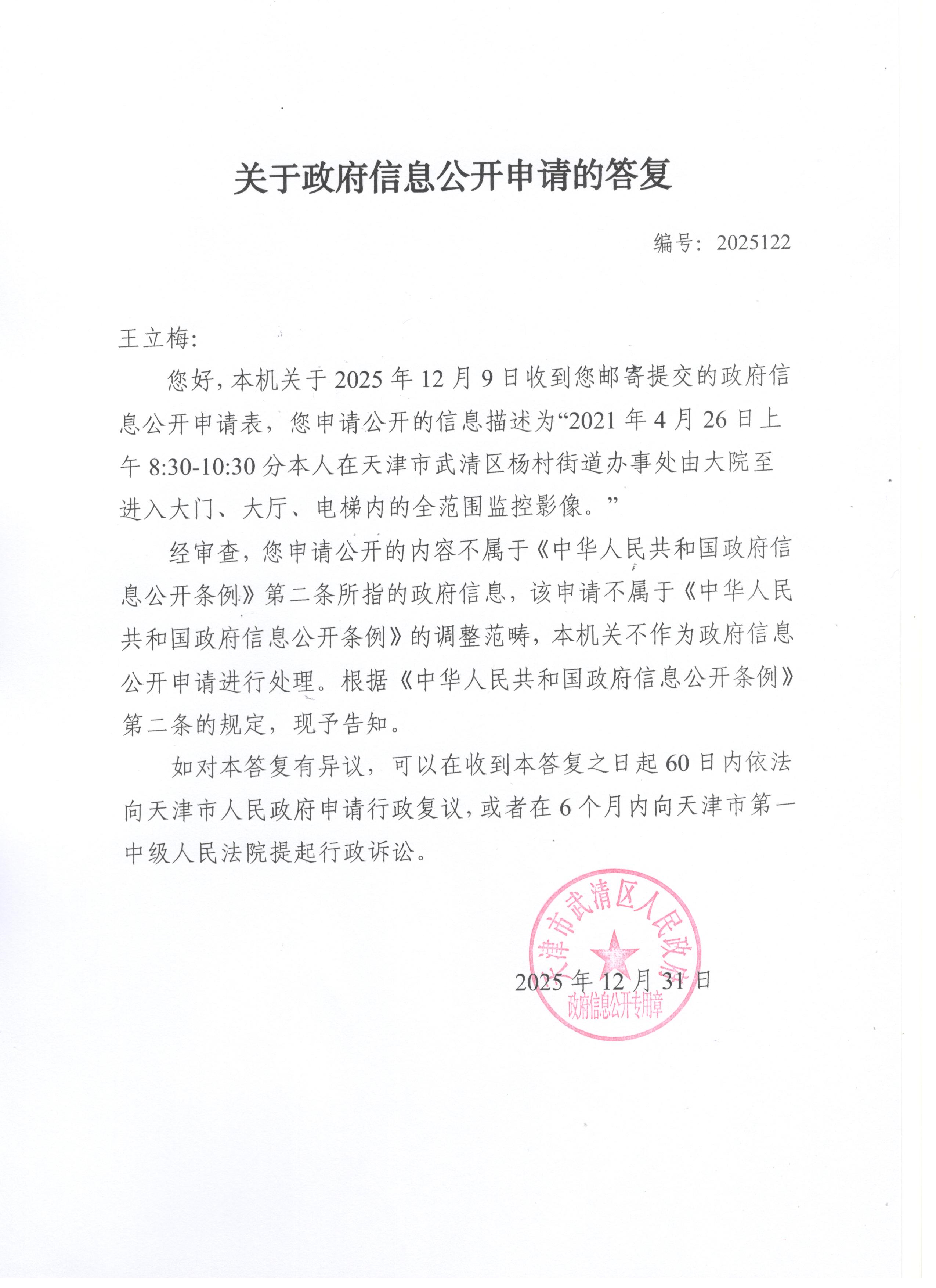 您好,本机关于2025年12月9日收到您邮寄提交的政府信息公开申请表,您申请公开的信息描述为“2021年4月26日上午8:30-10:30分本人在天津市武清区杨村街道办事处由大院至进入大门、大厅、电梯内的全范围监控影像。”