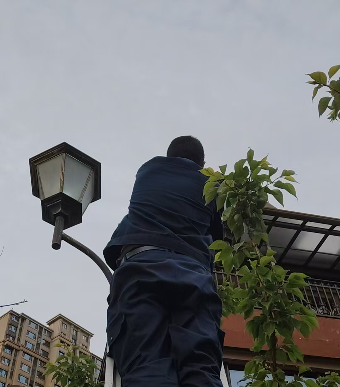 路灯,不仅是小区的照明设施,更是居民夜间出行的 “安全卫士”。明亮的路灯,能有效减少夜间事故的发生,提升居民的安全感。在检修过程中,维修工人身着工装在梯子上进行路灯维修作业。他们仔细检查每一盏路灯,不放过任何一个细节,确保路灯能够正常亮起,照亮居民回家的路。