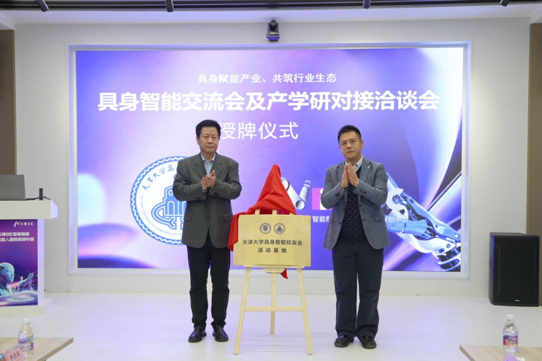 随后,天津大学电气自动化与信息工程学院党委书记李继平,天津iRIC副总经理、天津大学具身智能校友会副秘书长兰晨光为“天津大学具身智能校友会”活动基地揭牌。天津iRIC作为“天津大学具身智能校友会”的活动基地,将以线上研采平台和线下展示中心为运营载体,承接天津大学具身智能板块更多的产学研用合作。李继平在致辞中表示,该基地的落成,是天津大学献礼130周年校庆、积极布局未来产业的关键一步,旨在打造一个链接校友、科研与产业的强力纽带。学校将以天津iRIC为依托,以iRIC的五位一体生态服务体系为合作纽带,更加深入参与到产学研用融合中,共同推动技术创新与产业升级。