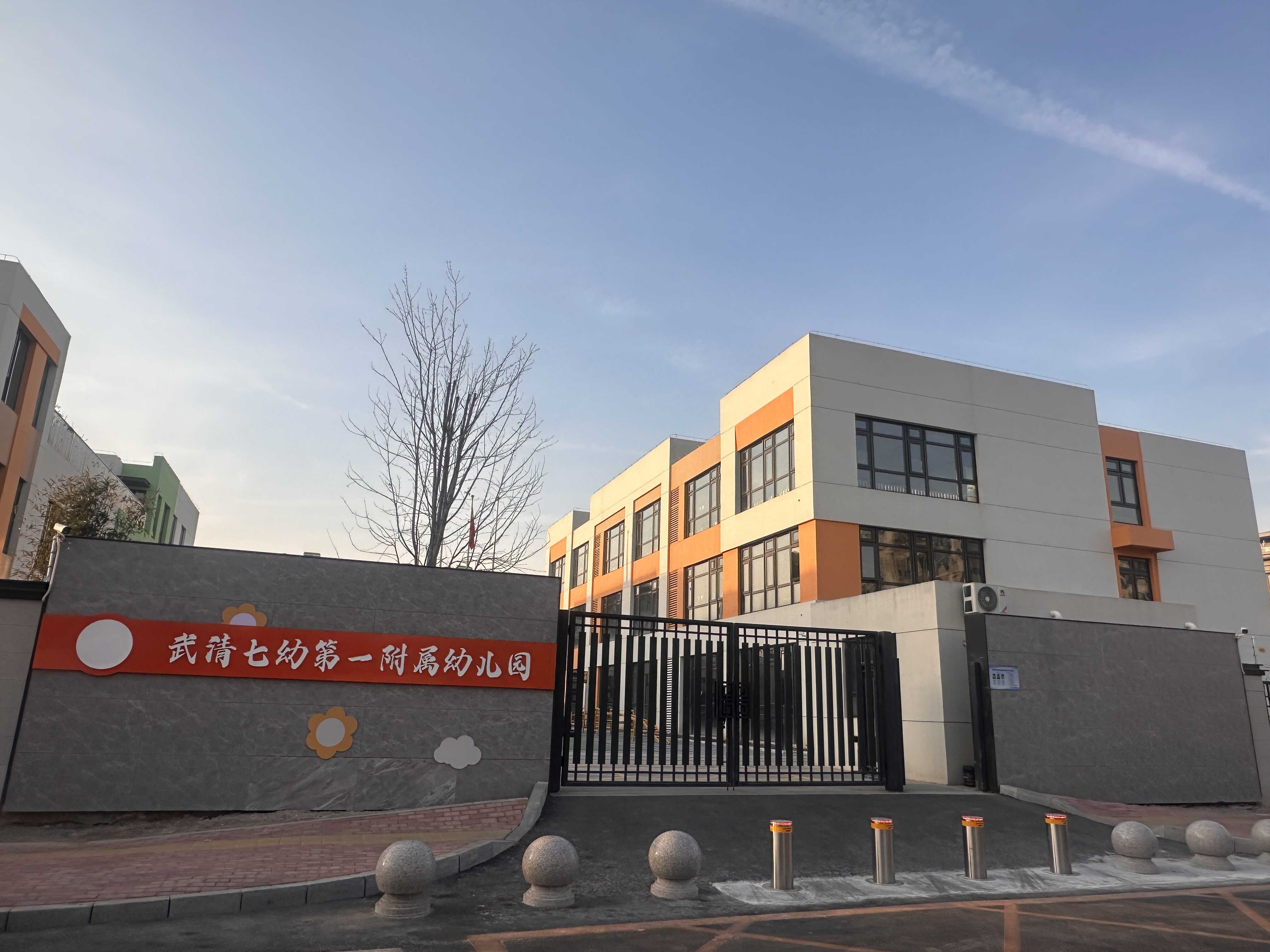 天津市武清七幼第一附属幼儿园,是武清区教育局直属公办幼儿园,占地面积约5500平方米,总建筑面积4500平方米,户外活动场地面积达3700平方米。园所整体采用现代化U字形设计,采光充足,空间通透,教室布局科学合理,充分满足幼儿户外探索与运动需求。幼儿园配备多功能活动区、STEAM科探功能教室、阅读角、艺术创作区等,为幼儿打造安全、舒适、富有童趣的学习与成长环境。