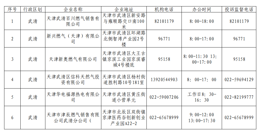 天津市武清区城市供气企业名录(管道气企业)