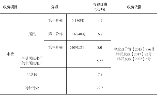 6.水价信息:按照《市发展改革委关于我市居民用水实行阶梯水价的通知》(津发改价管【2015】986号)、《区发展改革委关于武清区城区居民生活用水实行阶梯水价的通知》(津武发改【2017】72号)、天津市武清区发展和改革委员会《关于调整我区公共管网自来水销售价格的通知》(津武发改【2022】6号)文件规定,目前我公司供水区域水费价格标准为: