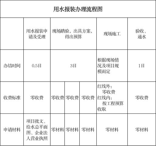 用水耗时:在公共供水管网覆盖区域内,符合接入条件的用水报装,供水企业办理包括受理登记和验收挂表2个环节,受理登记办理时间不超过0.5个工作日,验收挂表办理时间不超过1个工作日。