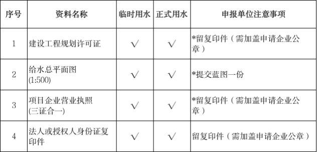 标注*必须提供(如证件及总平面图无法及时进行提供,可实行“承诺制”办理方式,可先行办理用水报装事宜,所缺文件于承诺期限内补齐即可。)