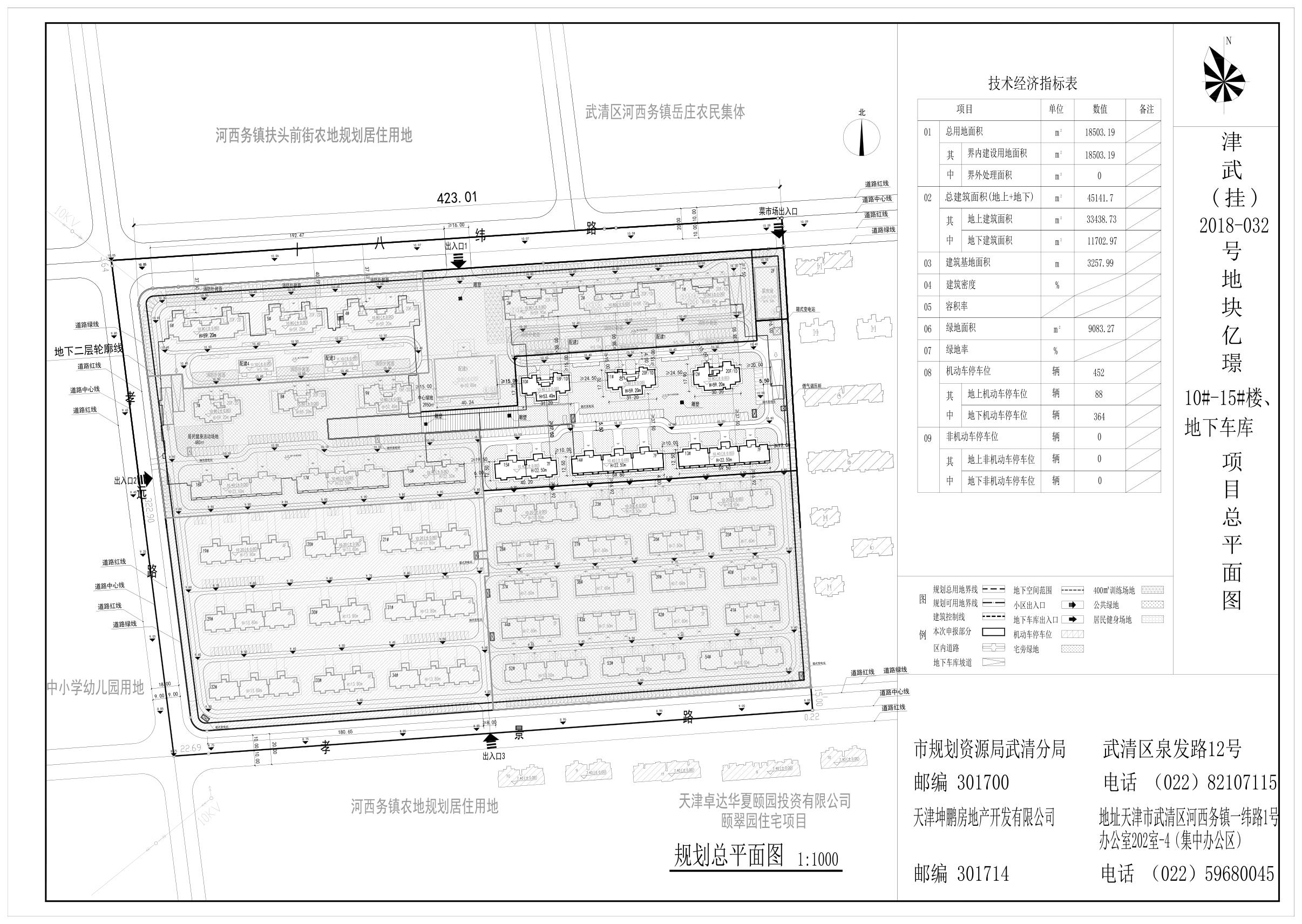 依据《中华人民共和国城乡规划法》、《天津市城乡规划条例》等相关法律法规的有关要求,现将审定后的天津坤鹏房地产开发有限公司亿璟园10#-15#楼及地下车库项目建设工程设计方案总平面图进行公布,公布期限自《建设工程规划许可证》批后至建设项目规划核实合格为止。