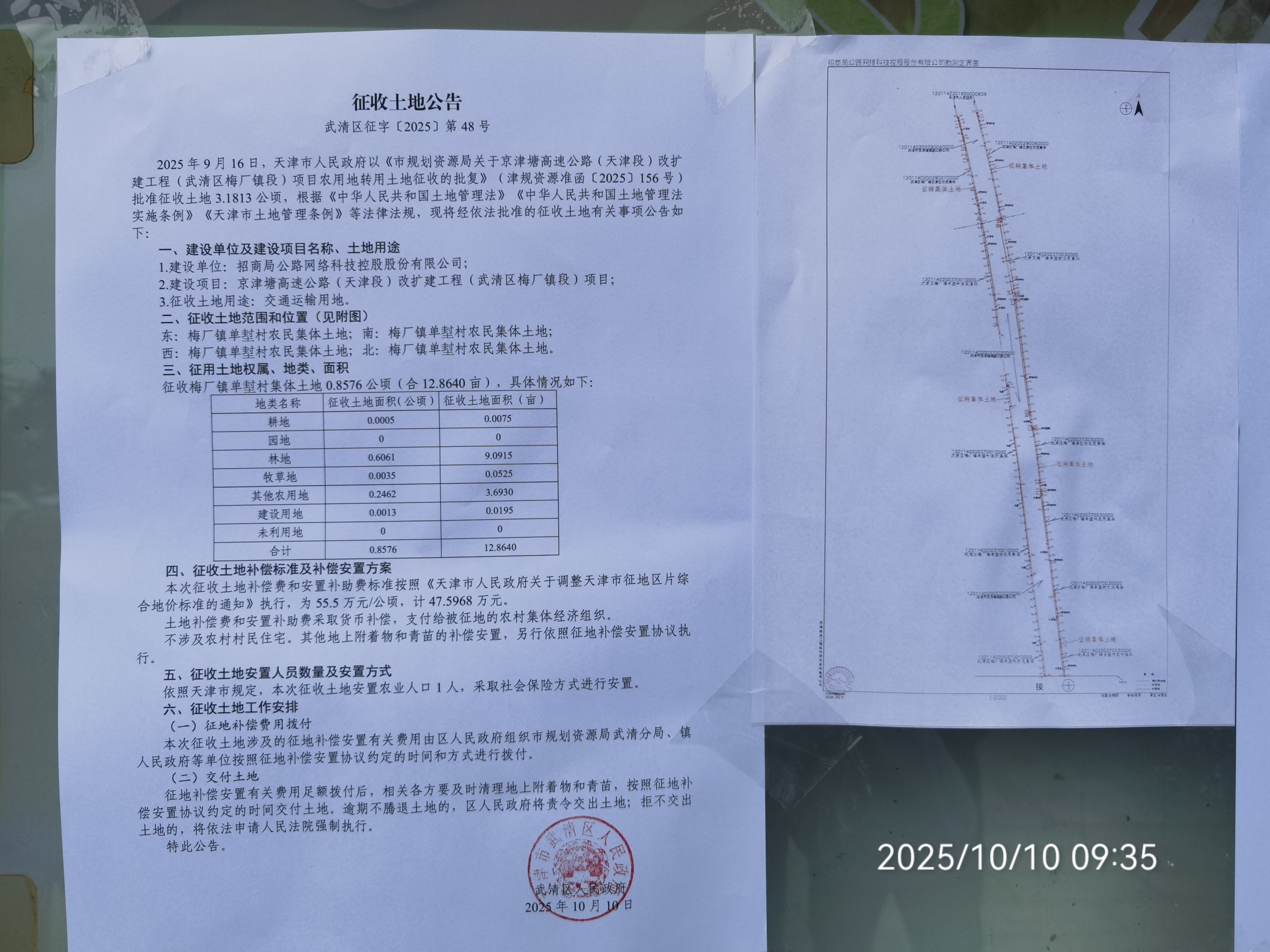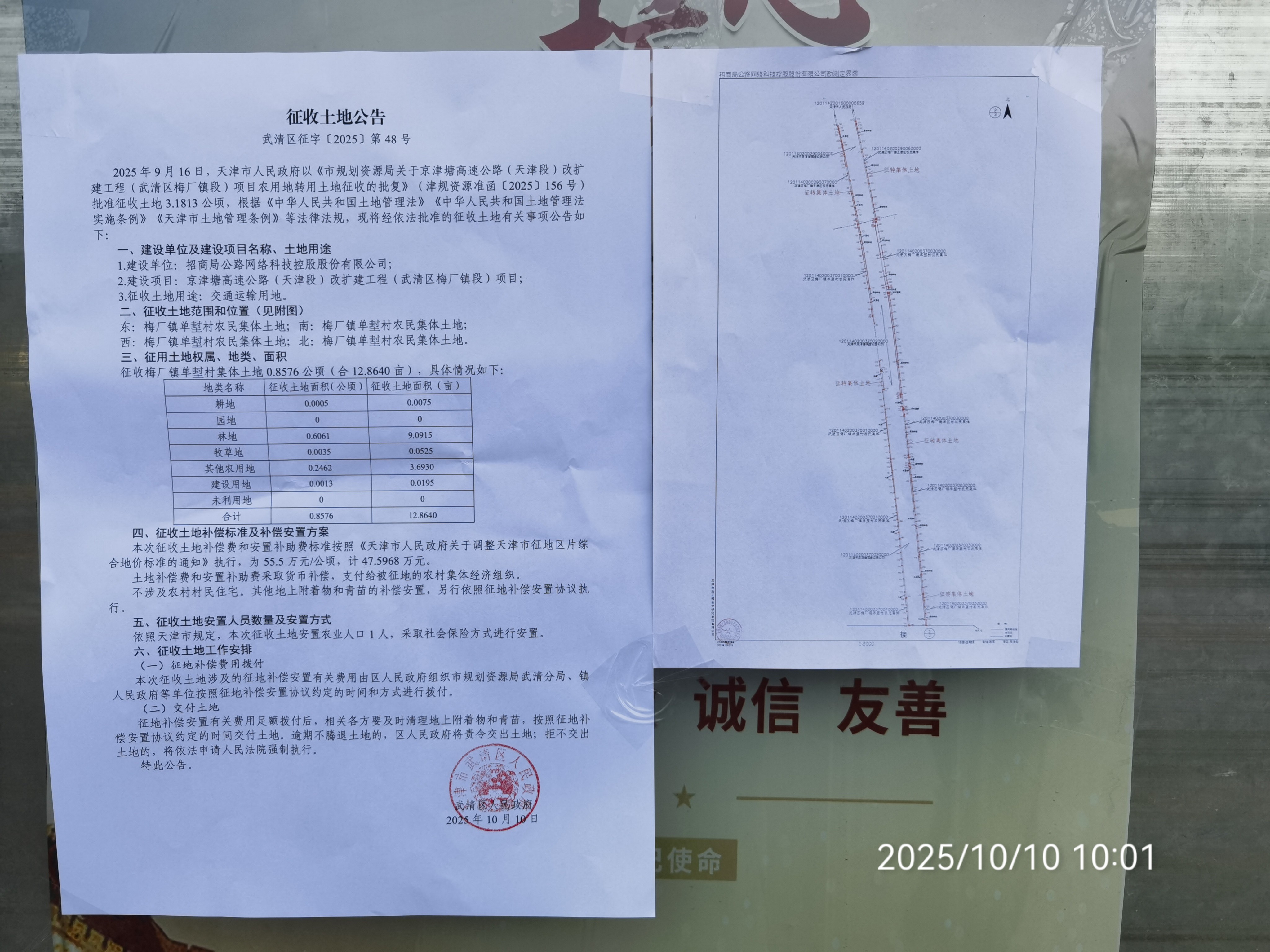 2025年9月16日,天津市人民政府以《市规划资源局关于京津塘高速公路(天津段)改扩建工程(武清区梅厂镇段)项目农用地转用土地征收的批复》(津规资源准函〔2025〕156号)批准征收土地3.1813公顷,根据《中华人民共和国土地管理法》《中华人民共和国土地管理法实施条例》《天津市土地管理条例》等法律法规,现将经依法批准的征收土地有关事项公告如下: